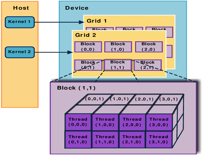 - Blocks are organized into grids. Each thread, block, and grid can be given specific indexes to manage data.