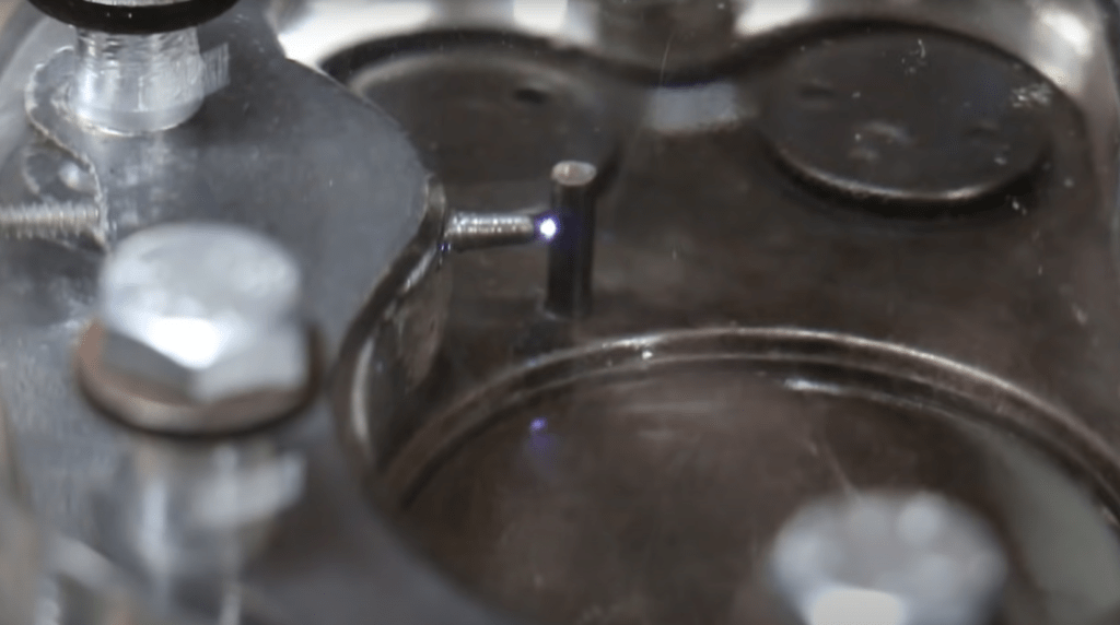 Firstly, the bright spot on the vertical rod is actually an electric spark acting as the ignition energy required to start off the combustion process. The gap is selected such that the voltage required to breakdown the medium inside releases enough energy for the fresh charge to ignite.