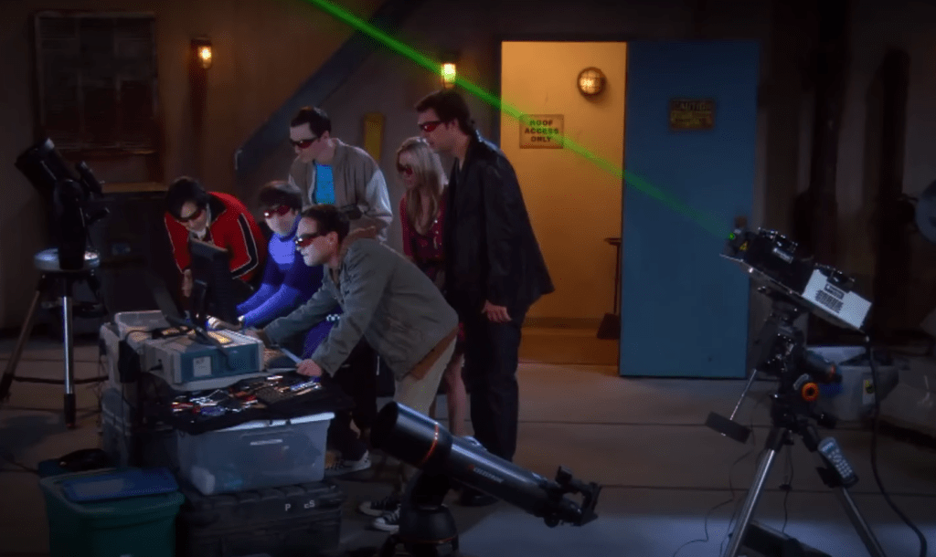I quickly connected it to this episode where Leonard, Sheldon, Howard, and Raj are setting up an experiment on the rooftop of their building. It can be seen that they have kept a laser emitter, photo multiplier and the data acquisition systems hooked up to a laptop in their attempt to perform the lunar ranging experiment by themselves. This is when penny and his then-current boyfriend, Zack, tag along with our PhDs (except the one!) while conducting this experiment. Leonard warmly explains to them what are they trying to do.