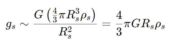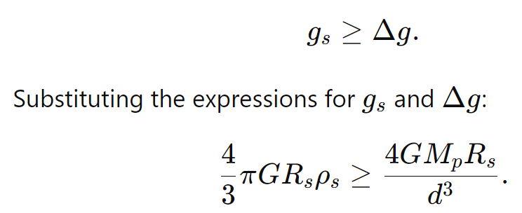For the satellite to remain intact, its self-gravity must exceed the tidal force that tries to pull it apart. If we treat the satellite as a fluid sphere of density ρs, its own gravitational acceleration (holding it together) is proportional to ρsRs. The tidal force from the planet depends on the planet’s mass Mp (or equivalently density ρp and radius Rp) and the distance ‘d’.
