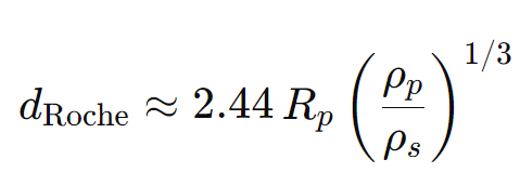 By equating the tidal force to the satellite’s self-gravity, one derives a relationship that sets a critical orbital radius dRoche. After some algebra and assuming the satellite is fluid, this process yields the commonly used Roche limit formula shown below,