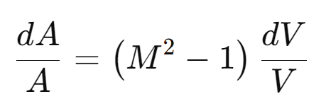 Subsonic Flow (M < 1): In this case, if the area A increases, the velocity V decreases. Conversely, a decrease in area results in an increase in velocity. This is due to the negative value of (M2−1) when M is less than 1, leading to an inverse relationship between dA and dV.