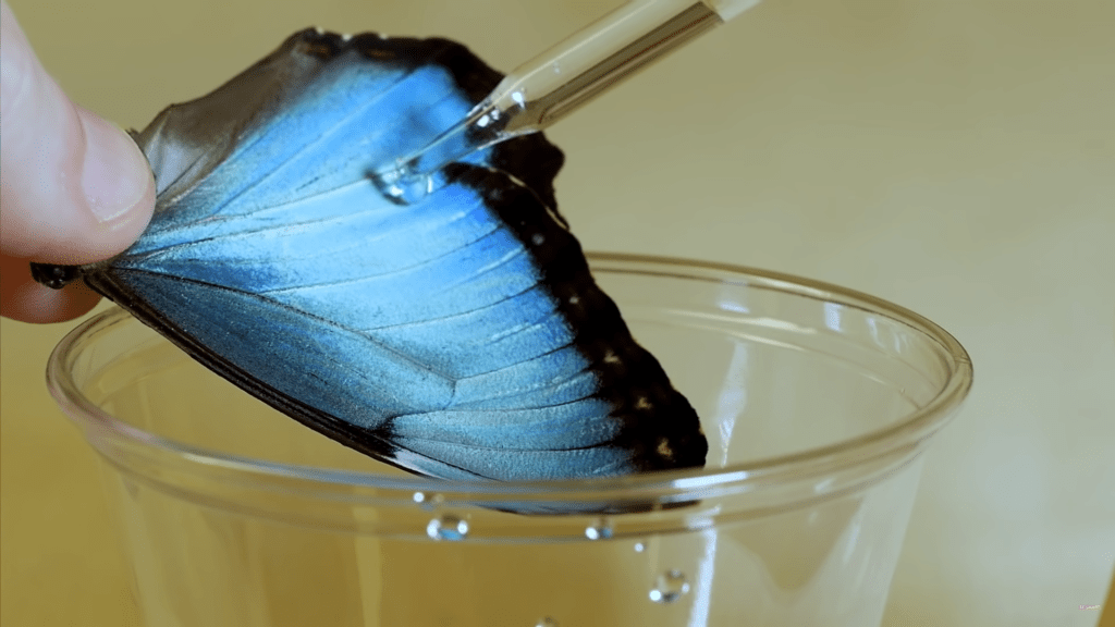 Now that we know how exactly these wings are structured, we might get a little creative and experiment a bit, further validating our theories. We know the constructive interference is because of the optical density of the air and the evolved structural path. So if I somehow change the optical path of the light travelling, we should be able to change the wavelength for the constructive interference. Let us try to drop alcohol on the blue dry wing. And here is how it looks! See the wet part of the wing, it is not blue any more, it is because we changed the refractive index of the wings be replacing air with alcohol.