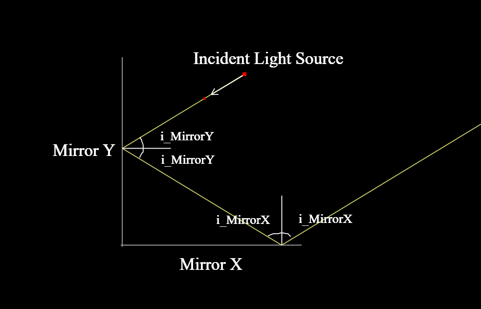 Firstly, for a good range of incidence angle on the Mirror Y, there will be two reflections taking place, one on Mirror Y and one on Mirror X. There are going to be the cases where the incident ray reflects on Mirror Y and passes off without falling up on the Mirror X. Secondly, whenever there is reflection on the Mirror X, the angle of incidence on Mirror Y and Mirror X will be complementary to each other (i.e. the sum of the angles equal to 90 degree; iMirror_Y + iMirror_X = 90 degree) If we extrapolate on this ides then, 2 * iMirror_Y + 2 * iMirror_X = 180 degree, do you remember this from somewhere? This is exactly the condition for having two lines parallel. Finally! We have successfully devised a mechanism which solves all of our problems. Reflects back the incident ray parallelly and is independent of the incident ray.